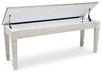 This bench invites you to strike a note for small space living. An inspired choice for coastal chic or modern farmhouse settings, this piano style bench with under seat storage sports a grayish white finish with rub through effect for timeworn appeal.