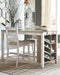 This counter height table with storage invites you to raise the bar on small space living. An inspired choice for coastal chic or modern farmhouse settings, this clean-lined, simply striking table doubles the charm with a brown tone top with plank effect, paired with a grayish white base with rub through effect for timeworn appeal. Built-in 8-bottle wine rack and pair of open shelves make the most of every inch of space.